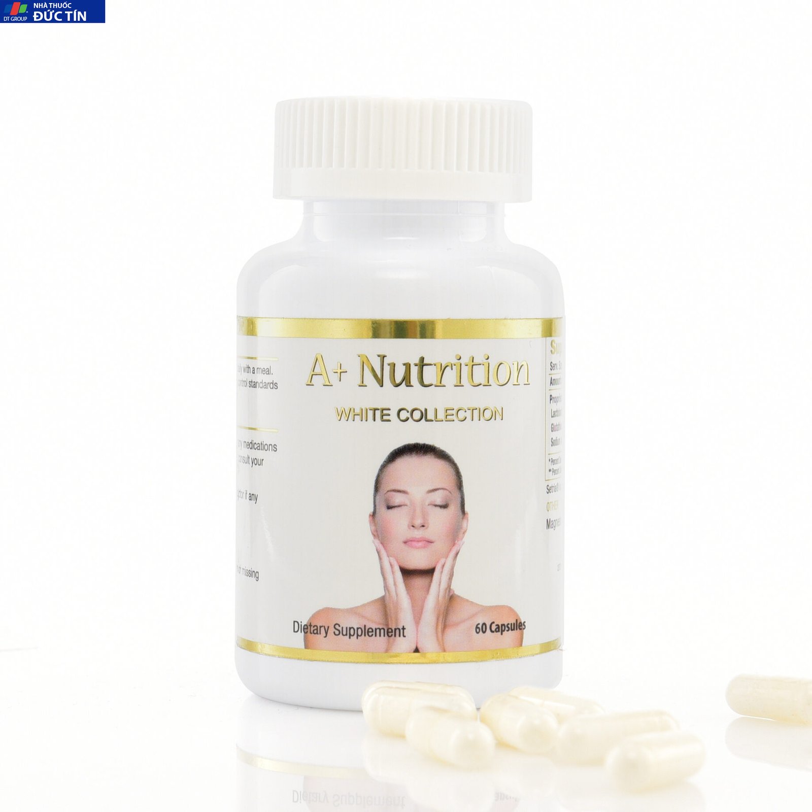Viên Uống Trắng Da – A+ White Collection Thành phần: Trong 2 viên có 800mg hỗn hợp bao gồm: Lactobacilus, N-Acetyl Cysteine, Glutathione, Collagen, Alpha Liopic Acid, Sodium Ascorbate. Thành phần khác: cám gạo, gelatin, Magnesium Stearate Công dụng: Giúp làm đẹp da, sang da, hỗ trợ làm mờ các vết thâm nám, chống lão hóa da. Chú ý: Thực phẩm này không phải là thuốc, không có tác dụng thay thế thuốc chữa bệnh. Đối tượng sử dụng: Người trưởng thành, người muốn chăm sóc da. Cách dùng: Uống 1 viên/lần, ngày uống 1-2 lần cùng với bữa ăn. Bảo quản: Bảo quản nơi thoáng mát, tránh ánh nắng trực tiếp |