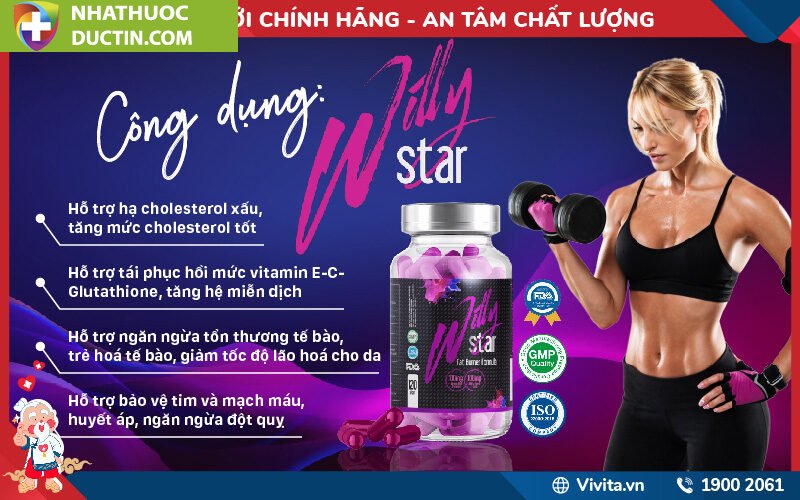 Viên uống hỗ trợ giảm mỡ tăng cơ Willy Star hiện là lựa chọn của rất nhiều vận động viên thể hình chuyên nghiệp và cộng đồng gymer để hỗ trợ giảm mỡ, tăng cơ, tăng cường sức khỏe tim mạch, huyết áp từ các loại hoạt chất có lợi là ALA, EGCG, GDL5.