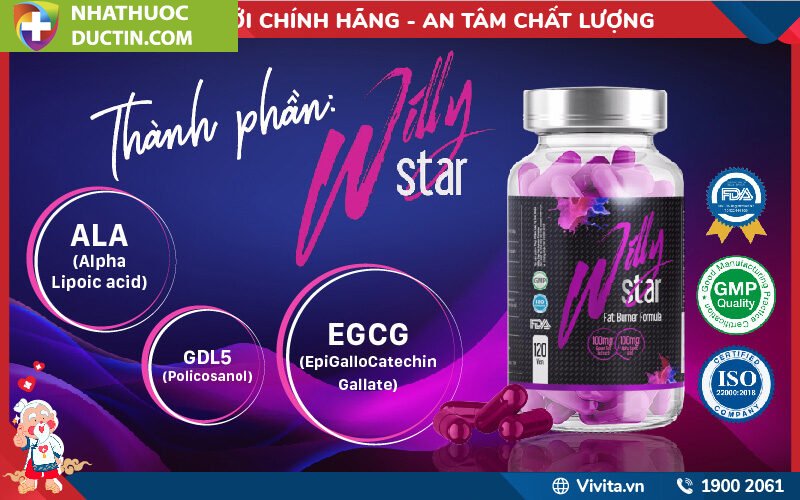 - Về thành phần: viên uống hỗ trợ giảm mỡ tăng cơ Willy Star được làm từ các hợp chất lành tính là ALA, EGCG, GDL5 nên người dùng có thể yên tâm uống hàng ngày, không cần lo về tác dụng phụ.
