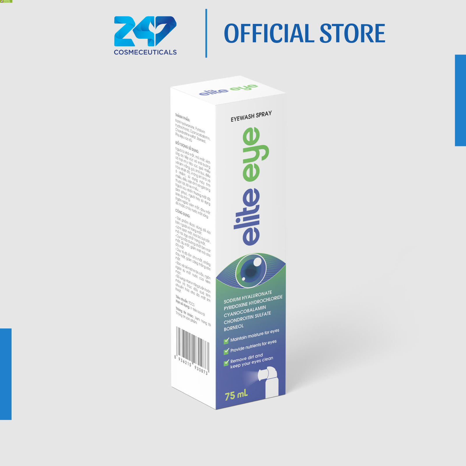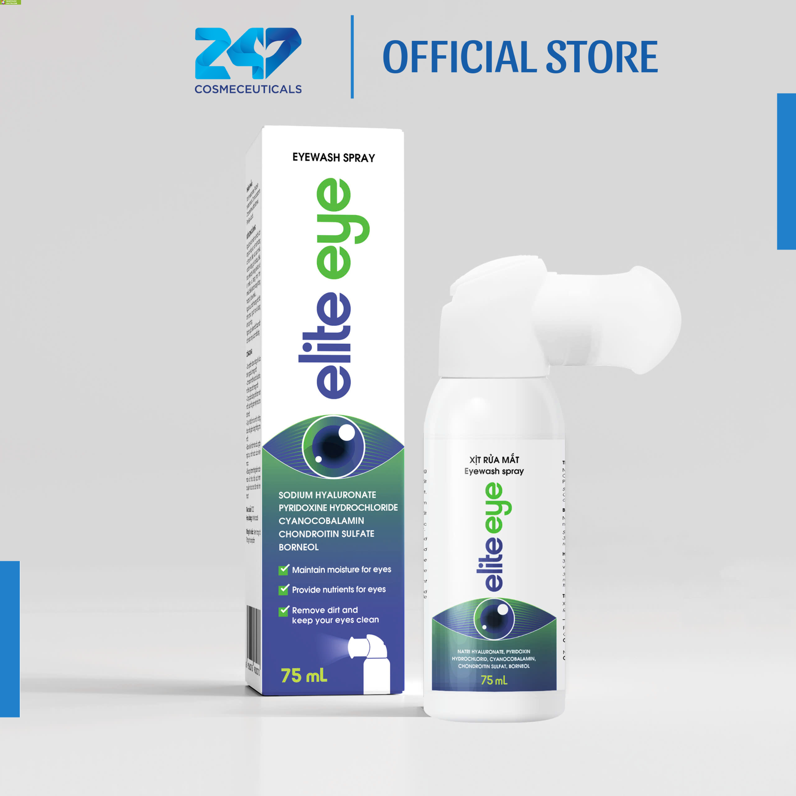Xịt rửa mắt Elite eye giúp làm sạch mắt, loại bỏ bụi bẩn, mồ hôi, tạp chất trong mắt, cung cấp dưỡng chất làm mát mắt, dịu mắt, giảm mệt mỏi cho đôi mắt, duy trì độ ẩm cho mắt.