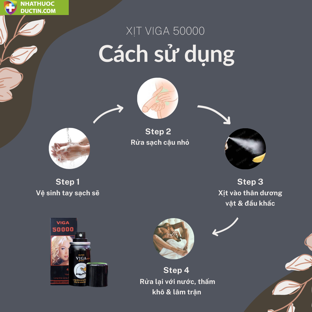 Viga 50000 được điều chế ở dạng xịt, do đó cách sử dụng khá đơn giản. Trước khi lâm trận, bạn chỉ cần xịt thuốc trực tiếp vào đầu dương vật. Tuy nhiên, để đảm bảo an toàn và mang lại hiệu quả tốt nhất, bạn nên tham khảo các bước sử dụng dưới đây: